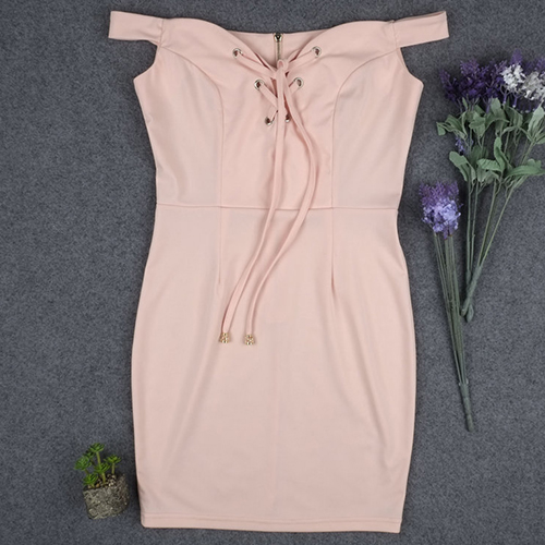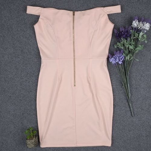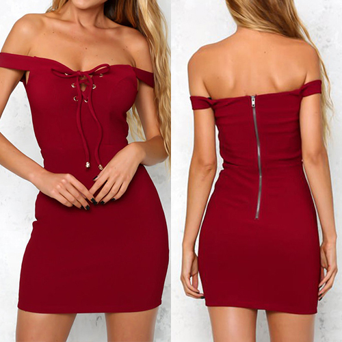 This beautiful dress features off shoulder, solid color and strappy and backless elements all