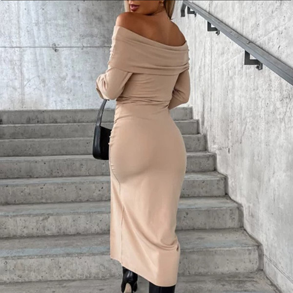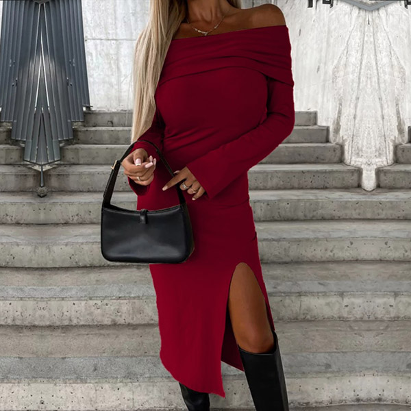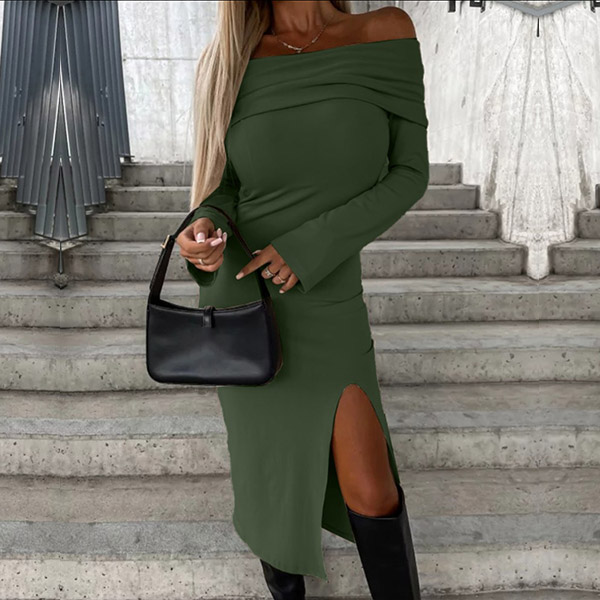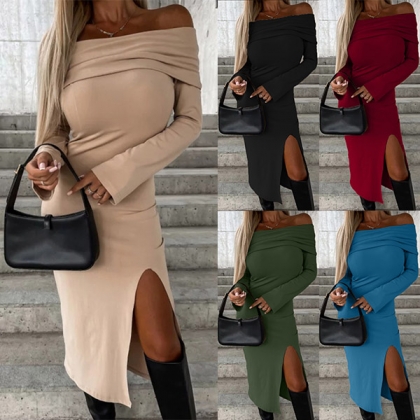 Sexy Solid Color Off-the-shoulder Long Sleeve Slit Bodycon Dress