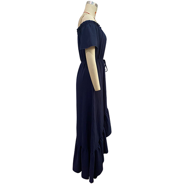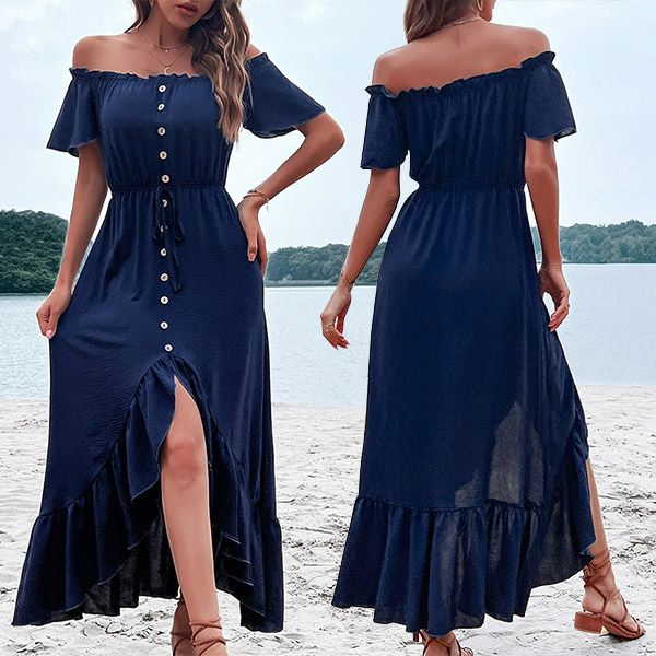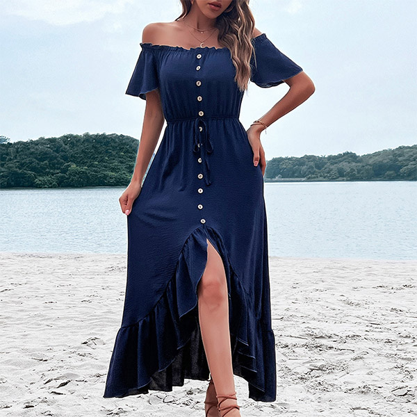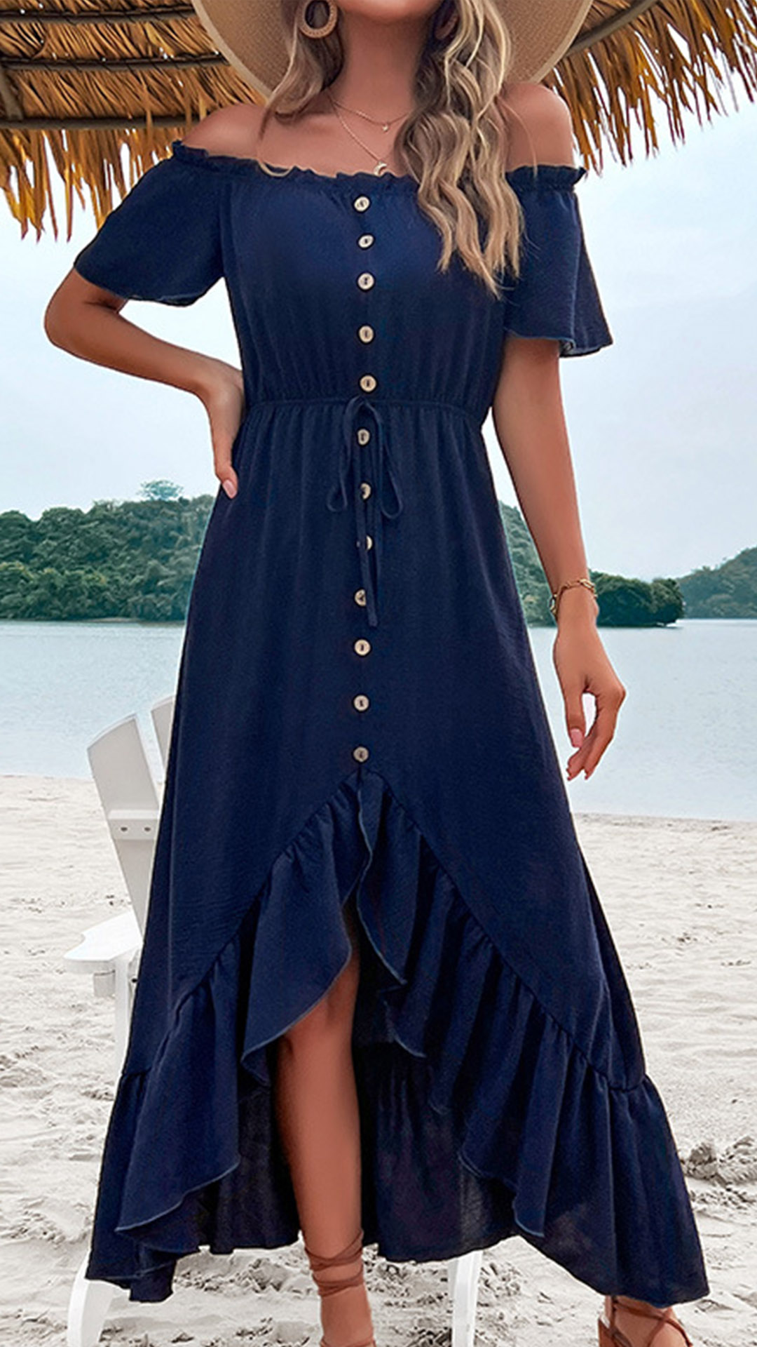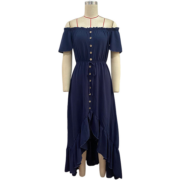 Sexy Solid Color Off-the-shoulder Short Sleeve Front Buttoned Ruffled Irregular Hemline Dress