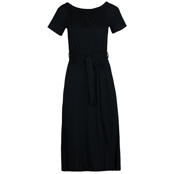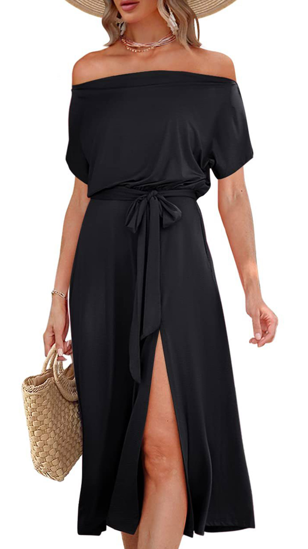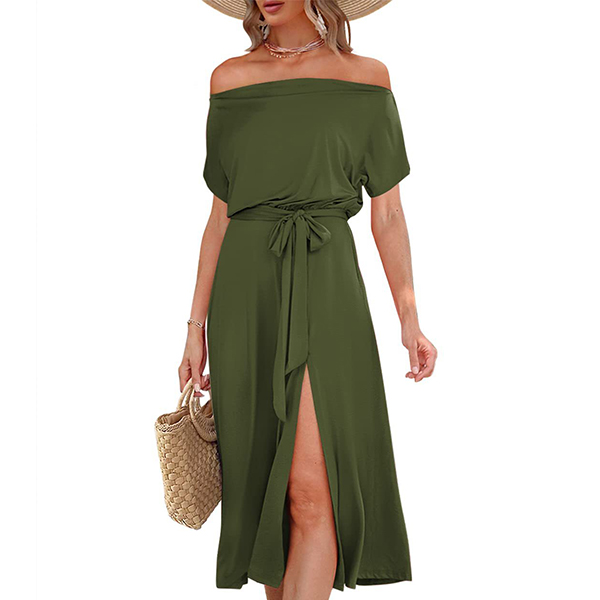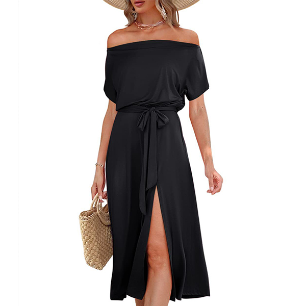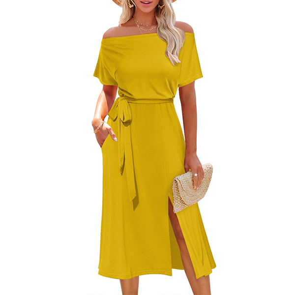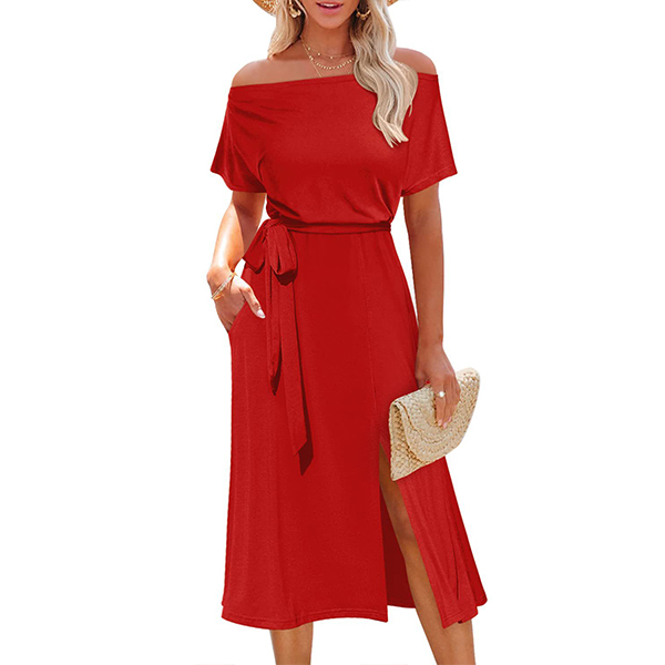 This dress features an off-the-shoulder design, highlighting the collarbone and shoulders for a flirty and feminine look. It also has short sleeves, self-tie belt and slit, adding a touch of sexiness and allowing for ease of movement. Wanna have one?
