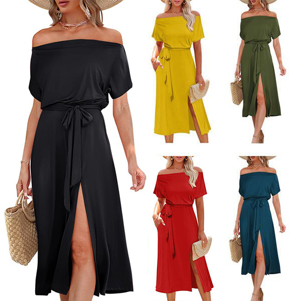 Sexy Solid Color Off-the-shoulder Short Sleeve Self-tie Slit Dress