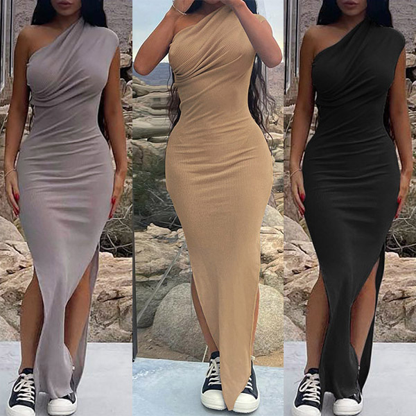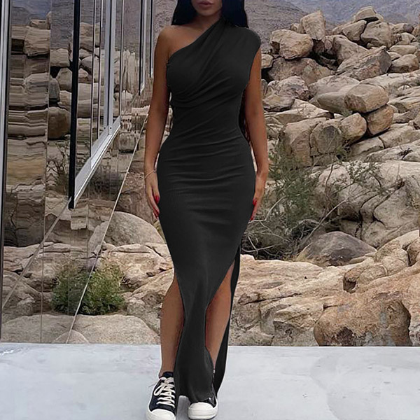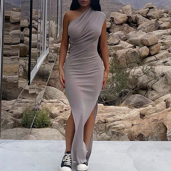 Sexy Solid Color One-shoulder Sleeveless Slit Bodycon Dress