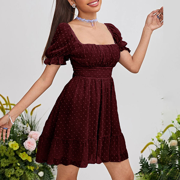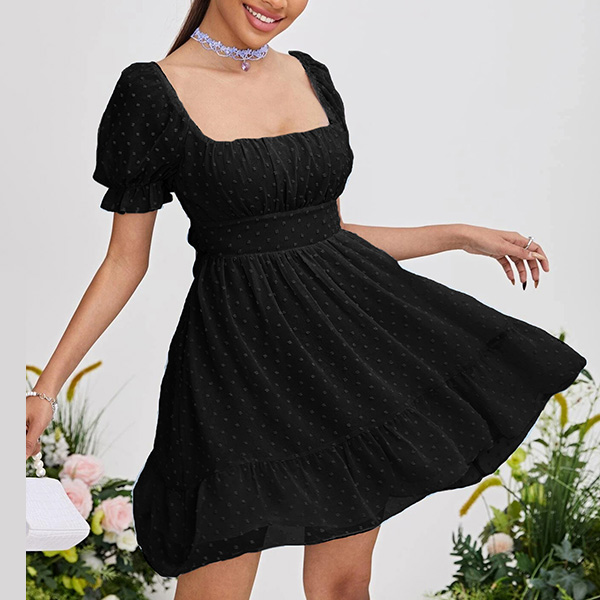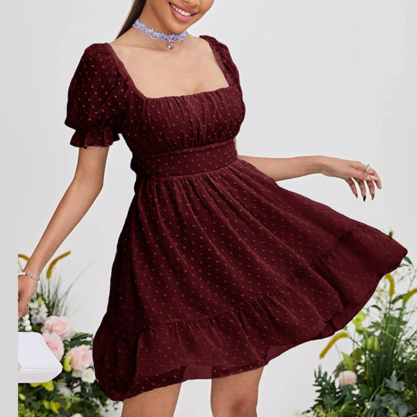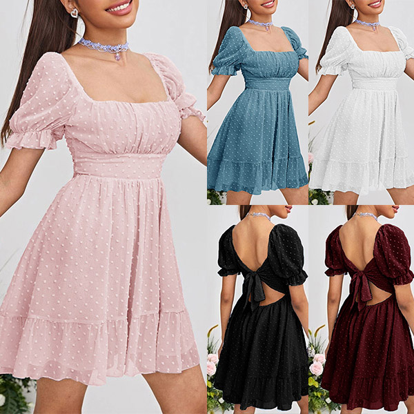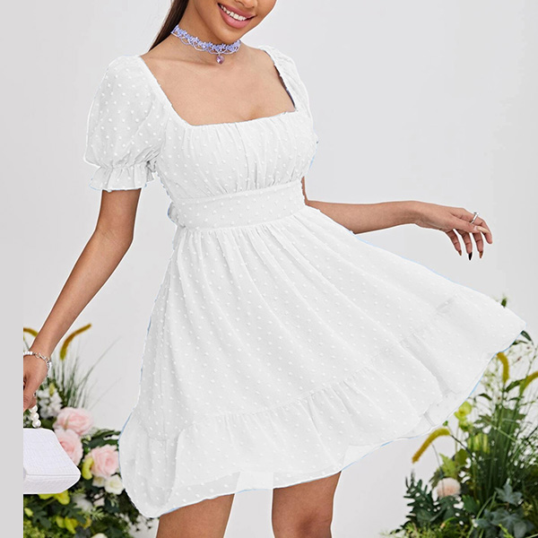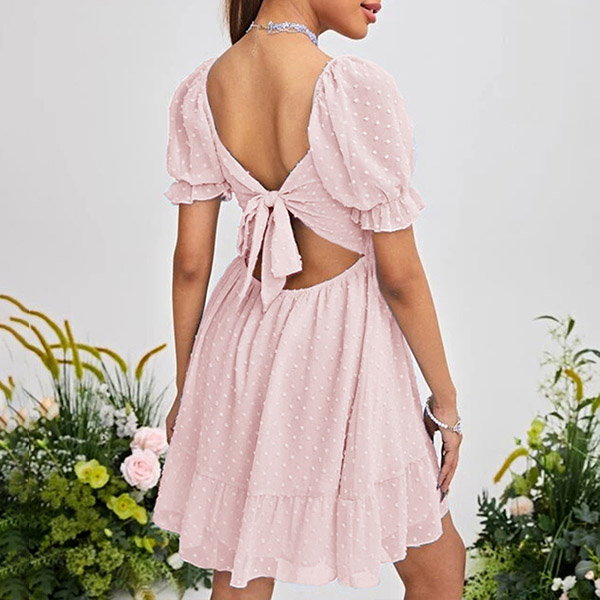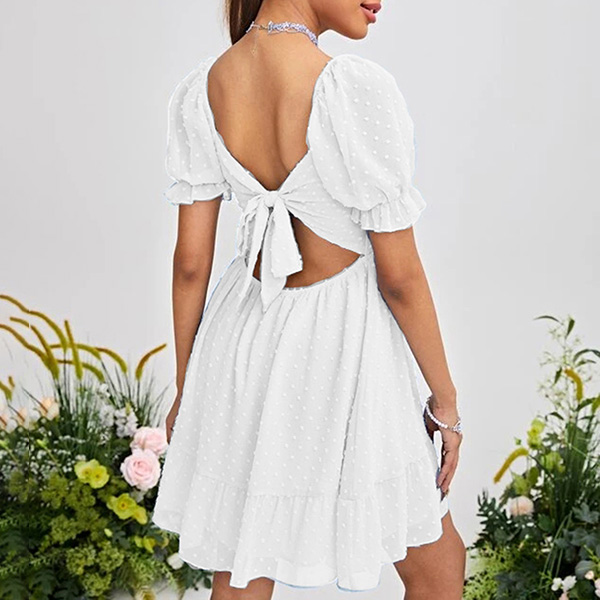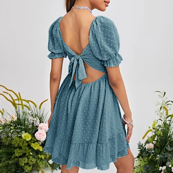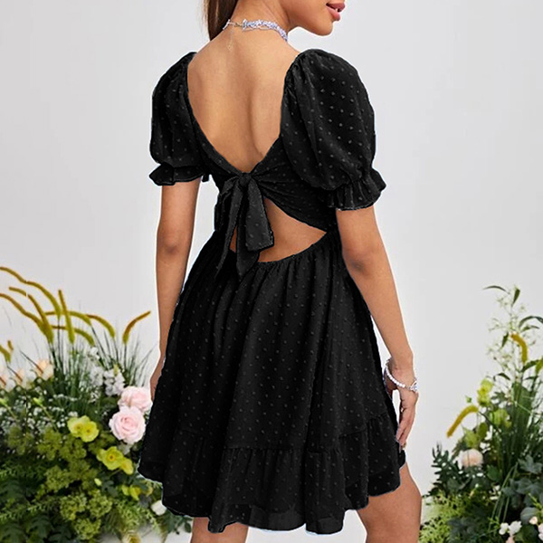 Sexy Solid Color Peasant Sleeve Scoop Neck High Waist Tiered Cutout Back-tie Swiss Dot Dress