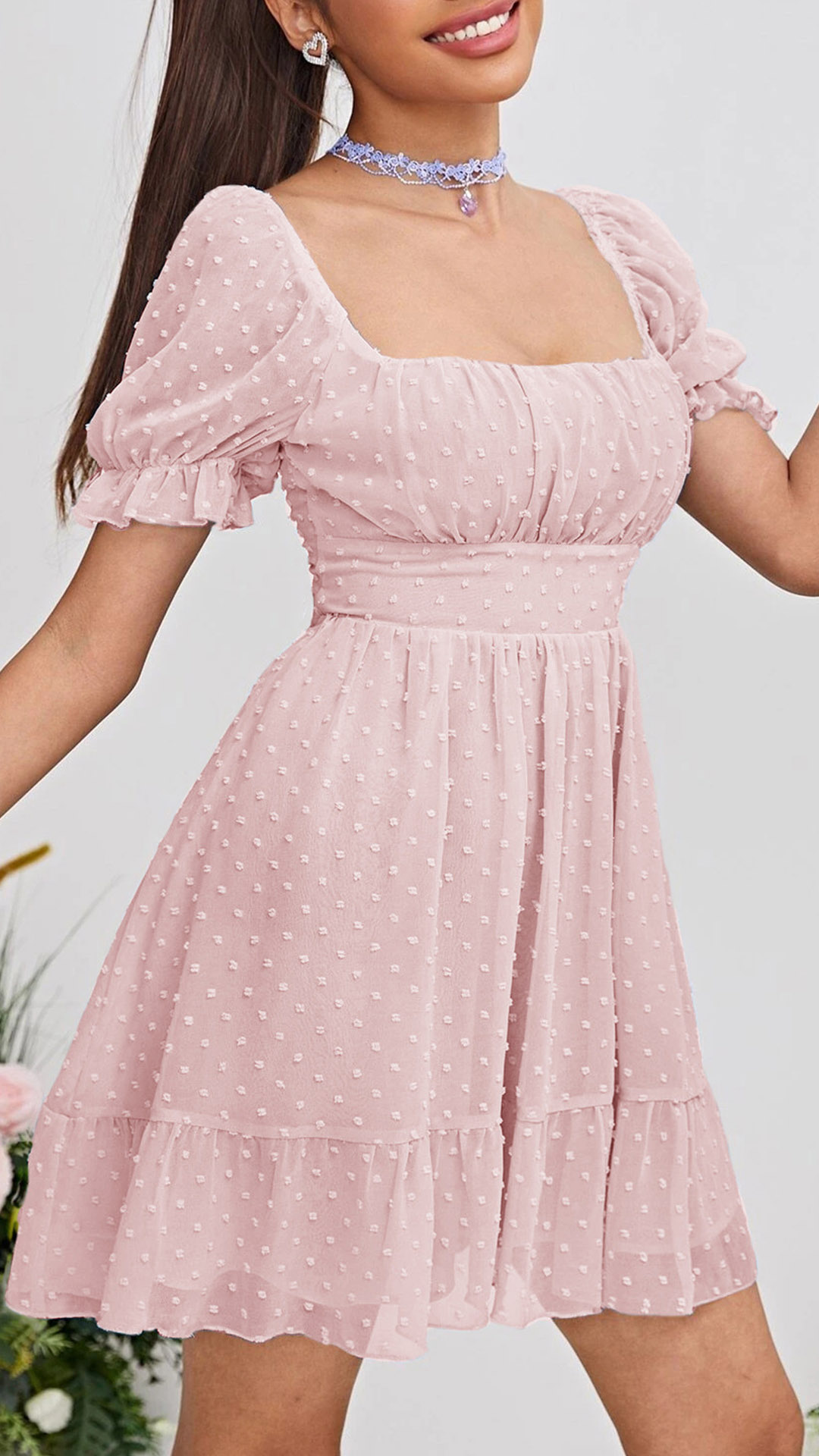 Mini dress featuring overall swiss dot, peasant sleeves, scoop neck, back cutout with back tie design, high waist, and tiered skirt. Wanna have a try?