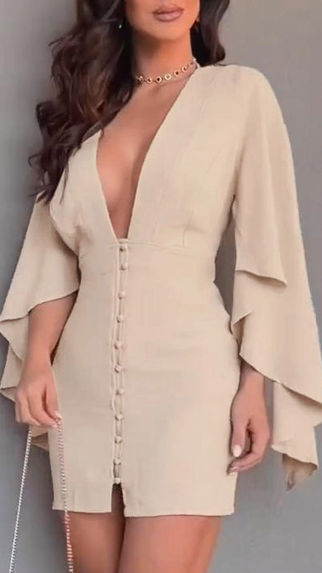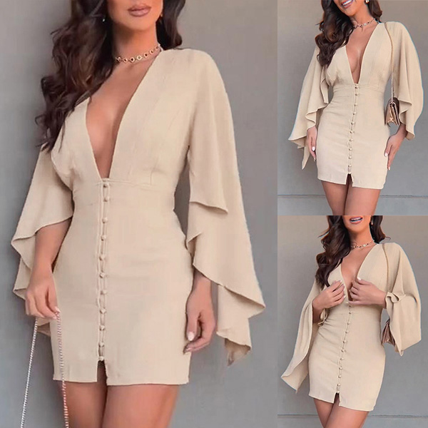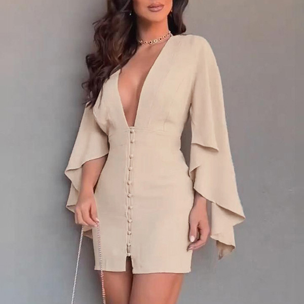 Sexy Solid Color Plunge V-neck Ruffle Elbow Sleeve Buttoned Bodycon Dress