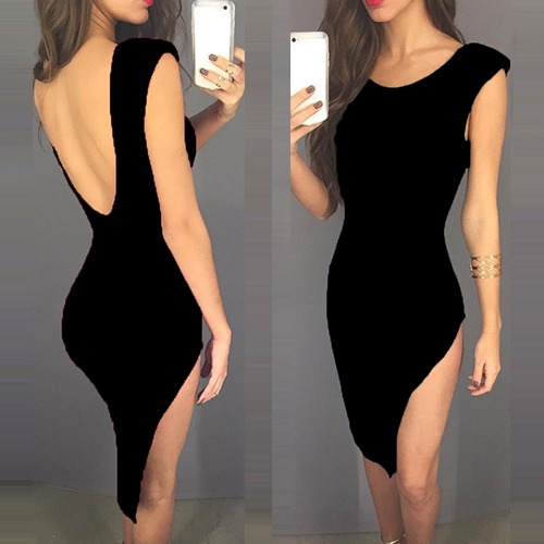 Boasting solid color, round neck, cap sleeve and backless design, sexy and sultry. Its irregular