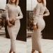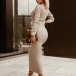 Sexy Solid Color Round Neck Long Sleeve Metal Button Ribbed Dress