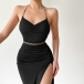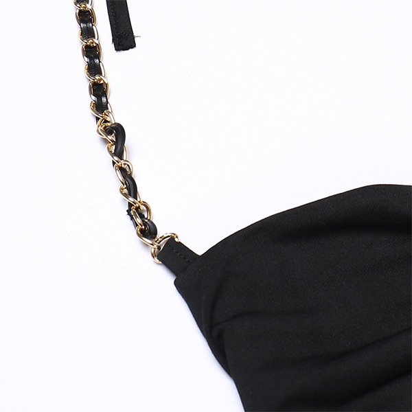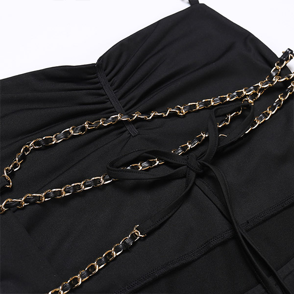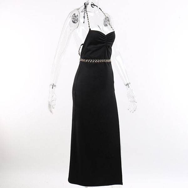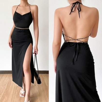 Sexy Solid Color Ruched Backless Slit Chain Bodycon Halter Dress