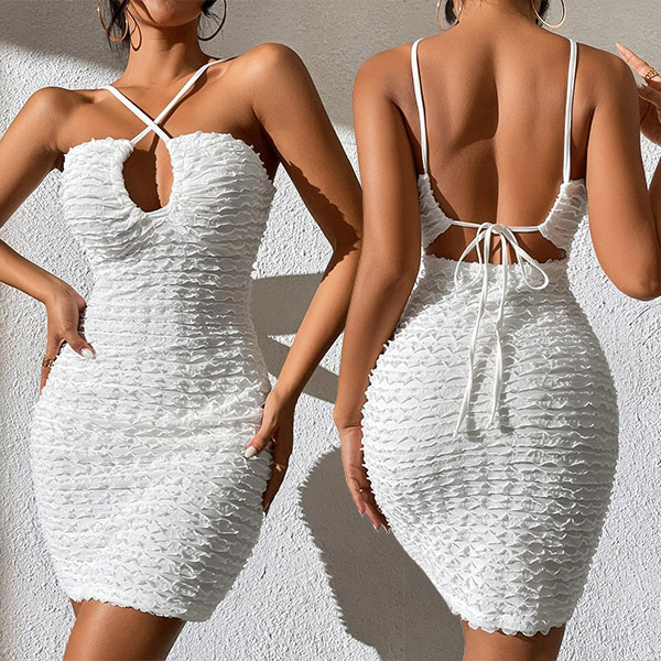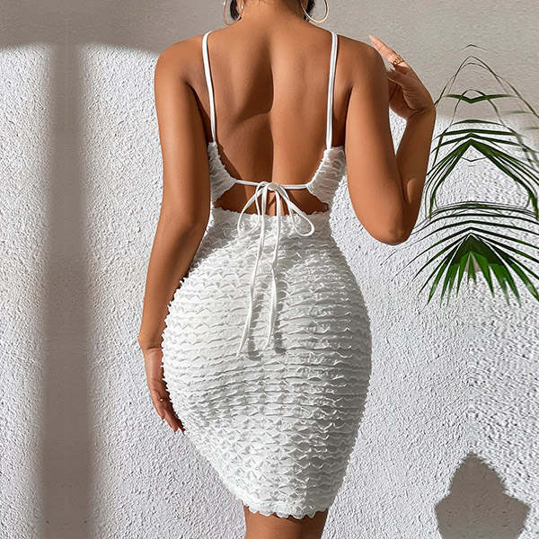 This Sexy Bodycon Dress is the perfect way to show off your sexy side. The solid color is perfect for any occasion, while the overall ruched details and cutout back add a touch of sexiness. The bodycon silhouette is figure-flattering and will hug your curves in all the right ways. Whether you're wearing this for a night out or a special occasion, you're sure to turn heads.