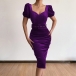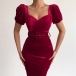 A velvet dress featuring solid color, sweetheart neckline, short peasant sleeves, bodycon silhouette, and waist belt. Pair this dress with heels and a clutch for a glam look.
