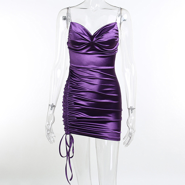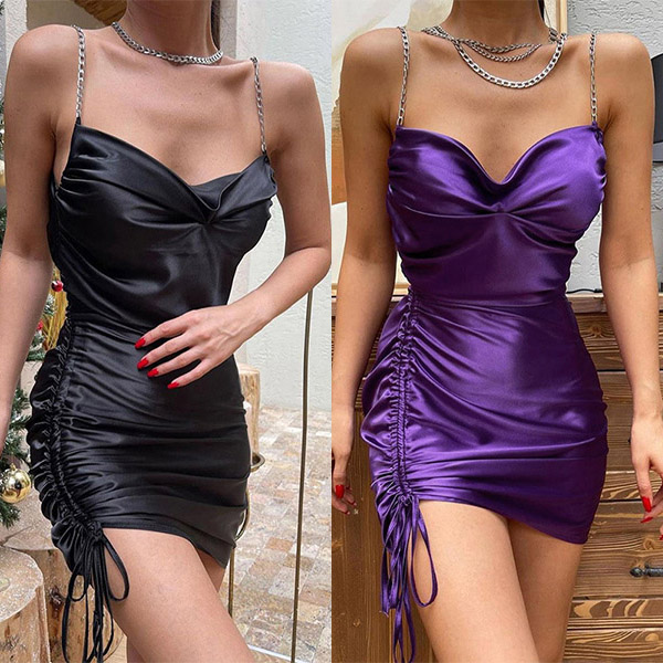 Short, fitted dress in soft material. Deep V-neck, narrow chain strap, and side drawstring forms the draped effect, it looks so flirty and sassy. When matching with your sexy heels and sparkle necklace,you can look more beautiful!