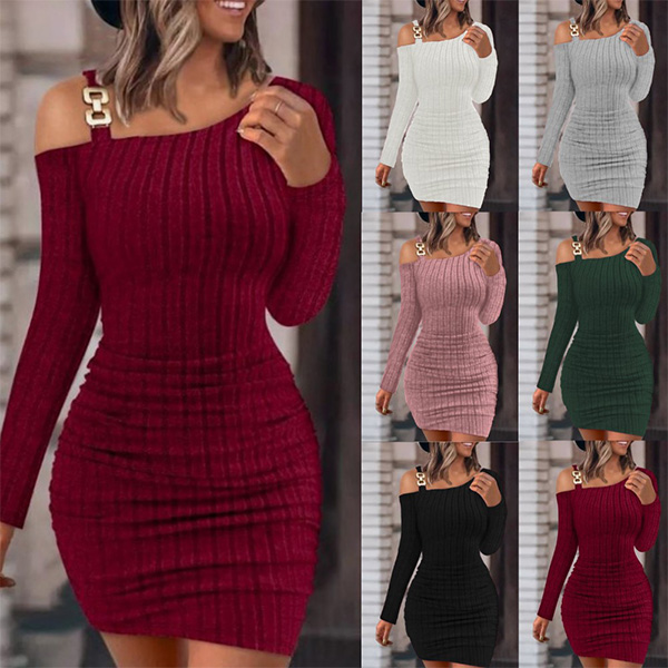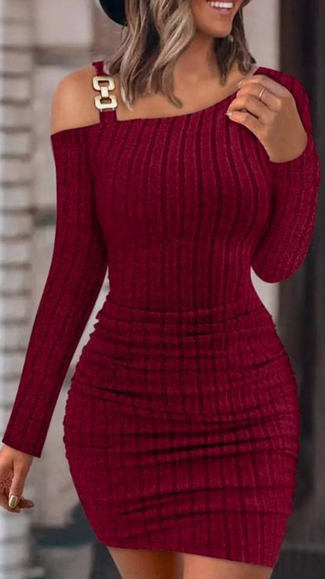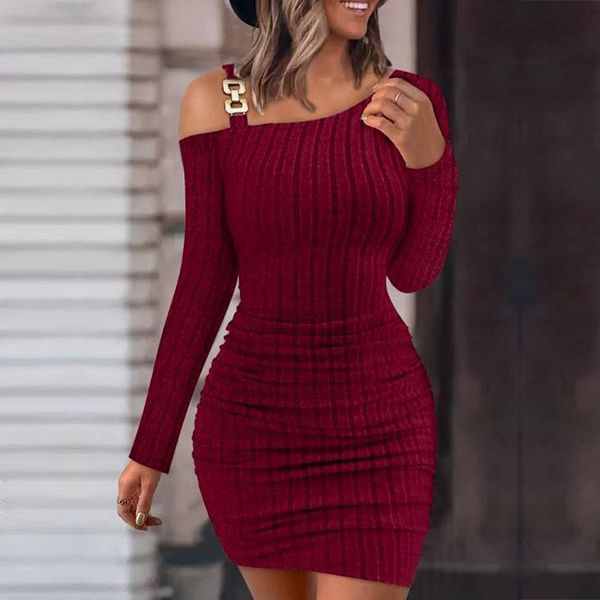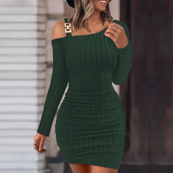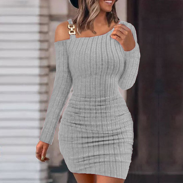 Sexy Solid Color Slant Shoulder Buckle Long Sleeve Ribbed Bodycon Dress