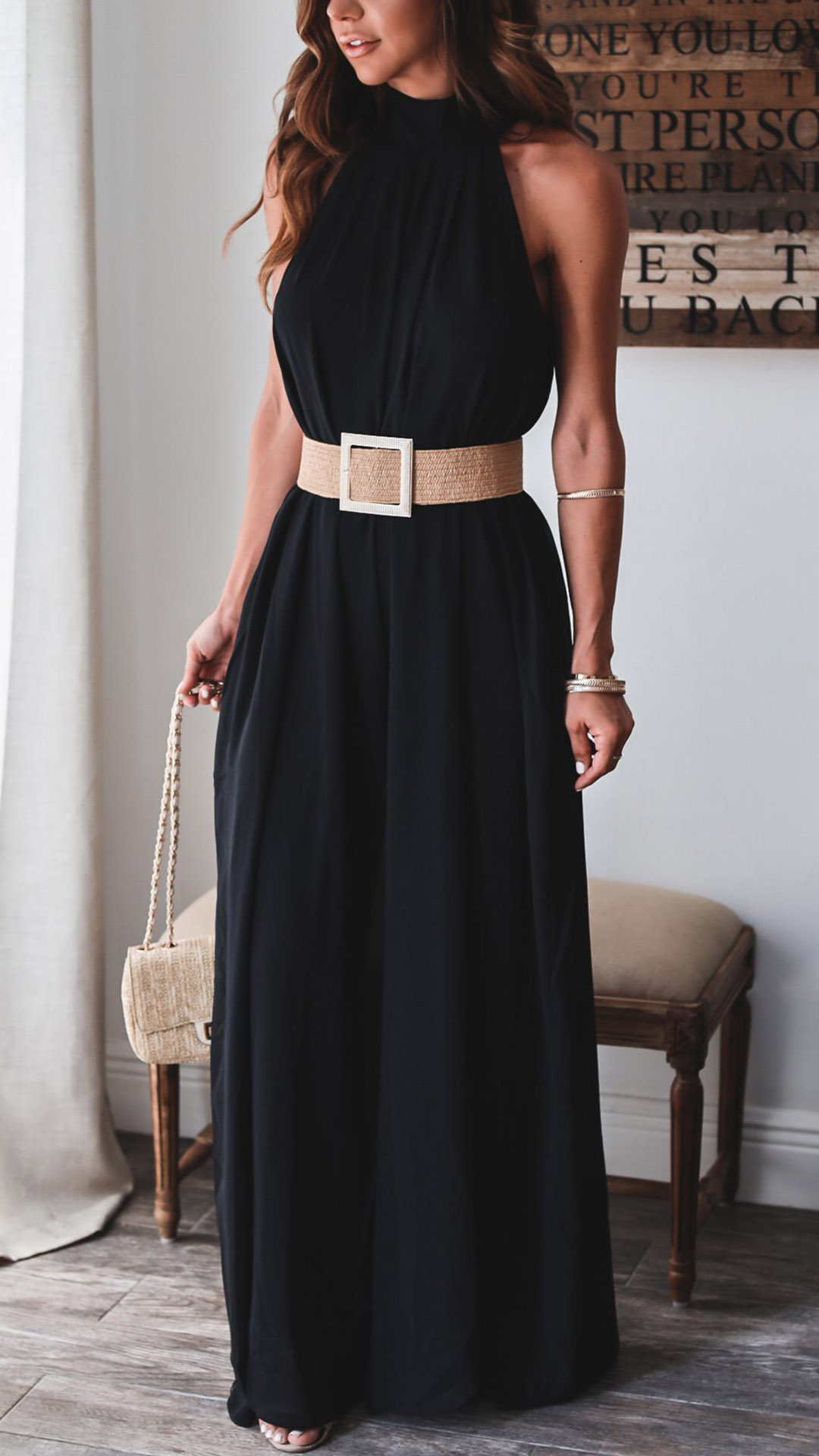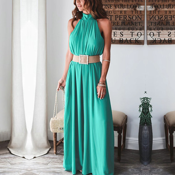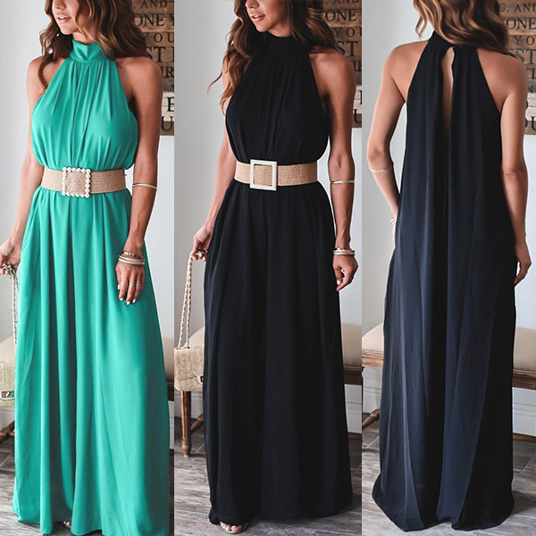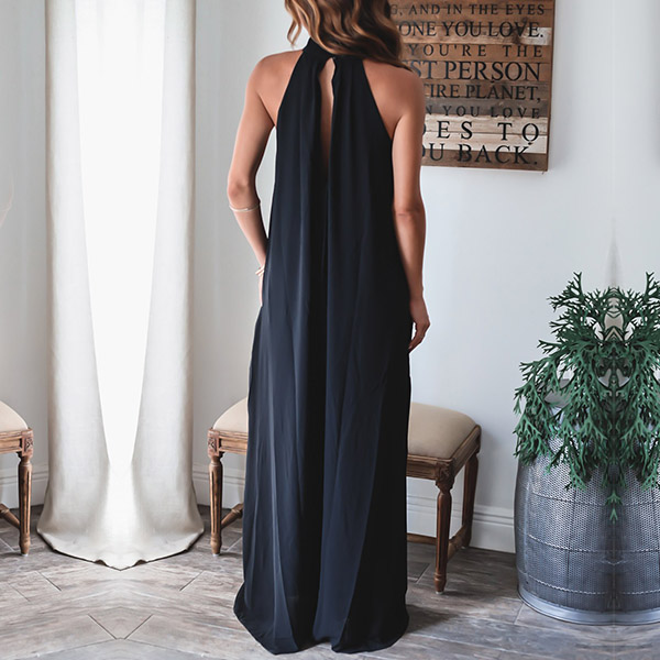 This is a beautiful and sexy maxi dress that is perfect for any summer occasion! Solid color, calf-length, loose fit and halter neck, hope you like it.
