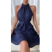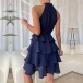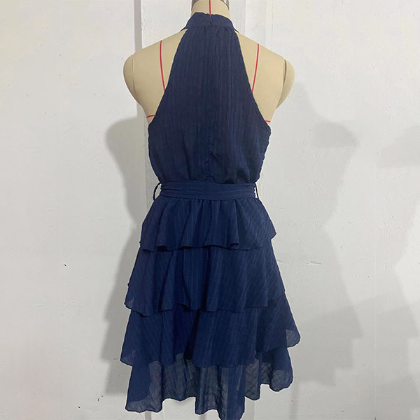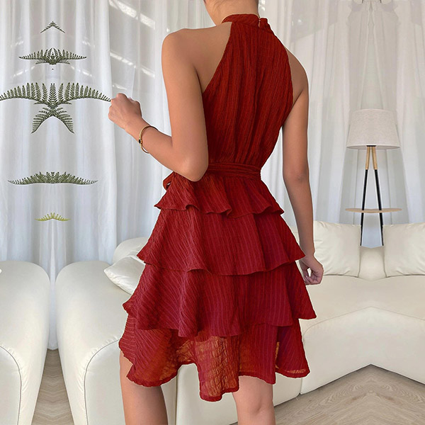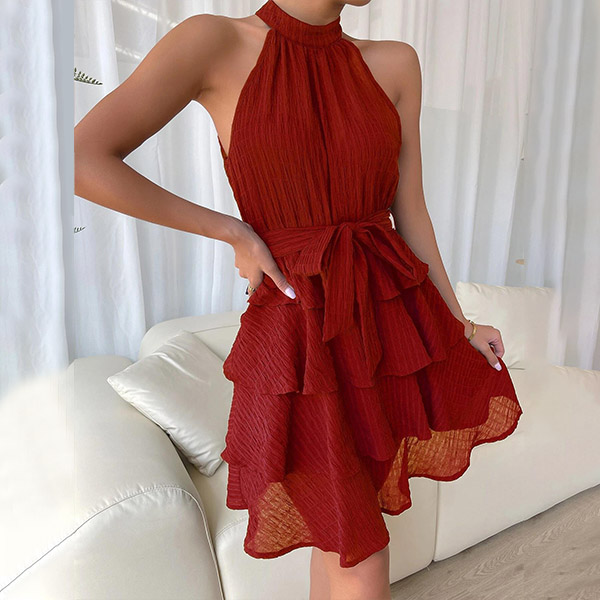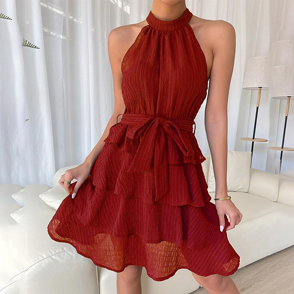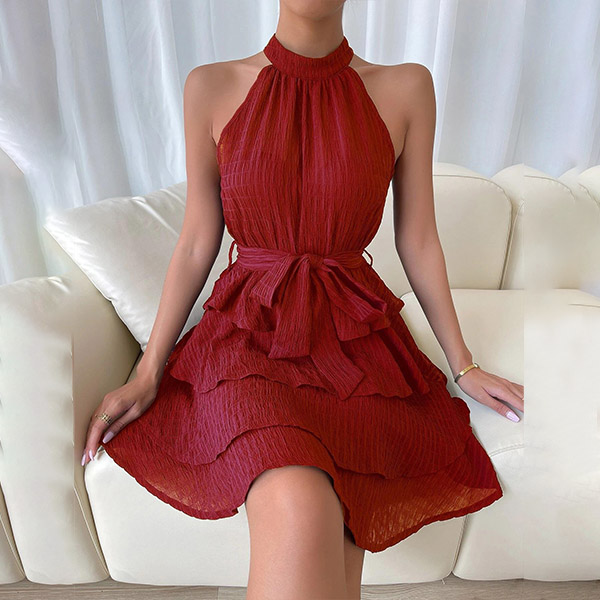 How about this dress? Solid color style, halter neck, and self-tie waist belt adds a touch of class, and the tiered skirt is both flattering and fun.