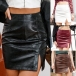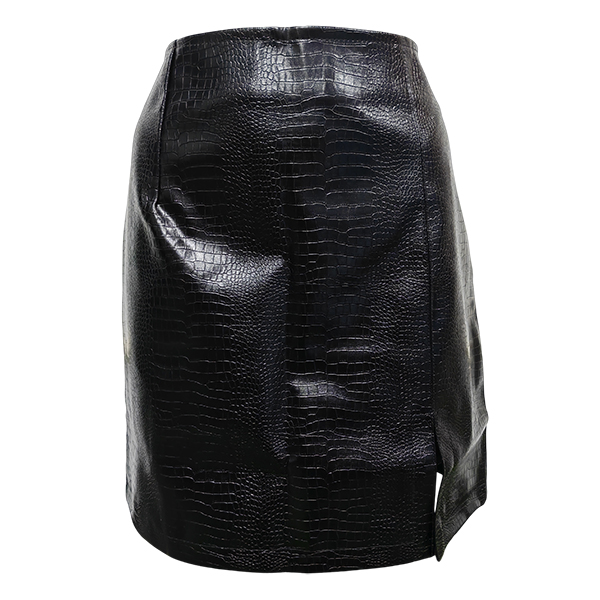 This skirt is made of artificial leather and features a slit up the front. The solid color makes it versatile and easy to style.