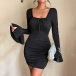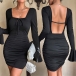 Sexy Solid Color Square Neck Long Sleeve Backless Ruched Bodycon Party Dress