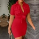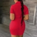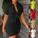 Sexy Solid Color Stand Collar Buttoned Self-tie Short Sleeve Bodycon Dress