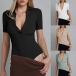 Sexy Solid Color Stand Collar V-neck Short Sleeve Bodysuit
