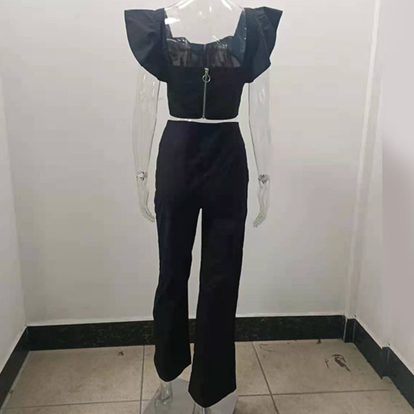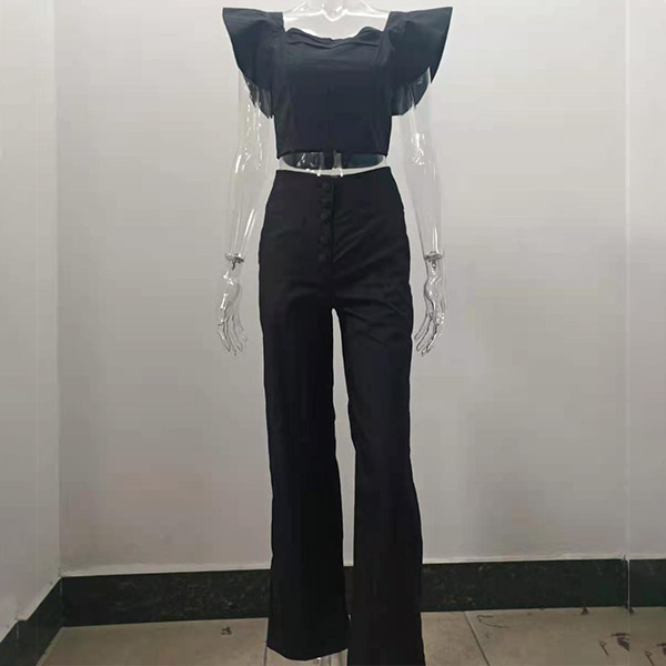 Sexy Solid Color Two-piece Set Consist of Ruffled Ruched Crop Top and High Waist Wide-leg Pants