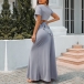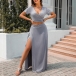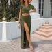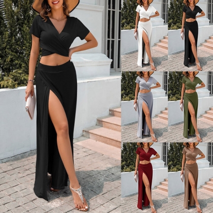 Sexy Solid Color Two-piece Set Consist of V-neck Crop Top and High Slit Maxi Skirt