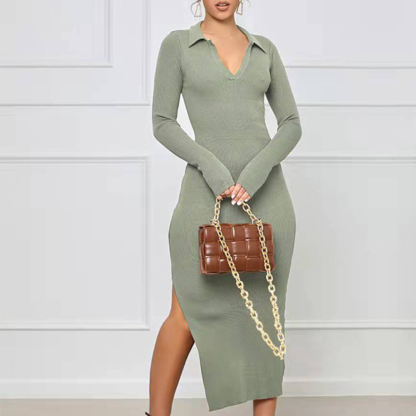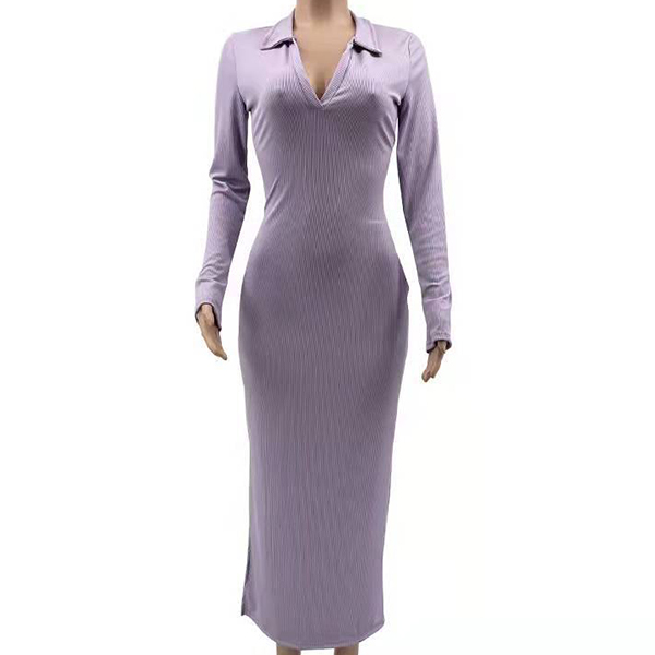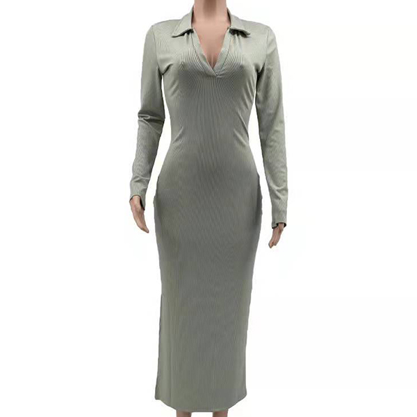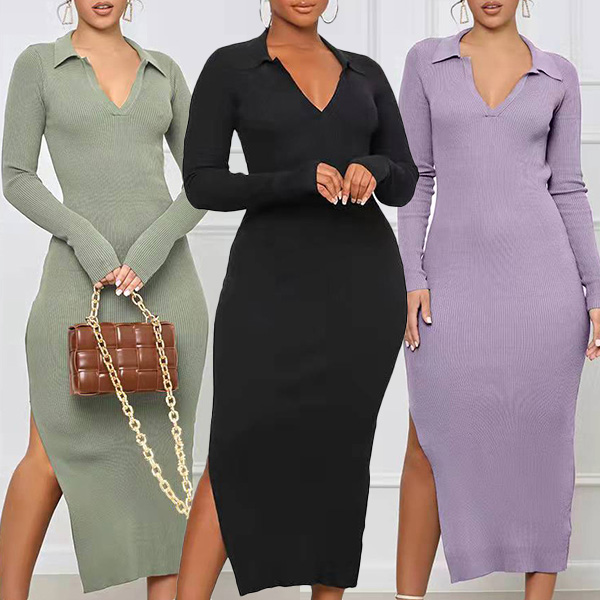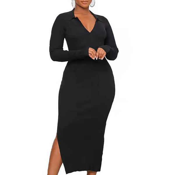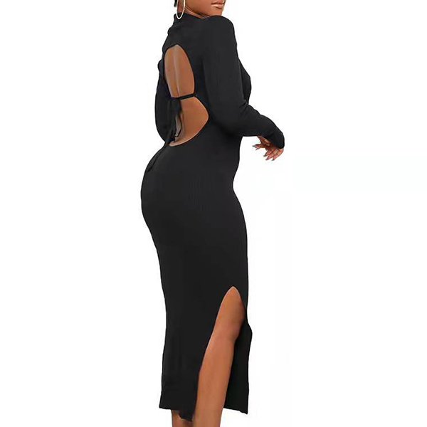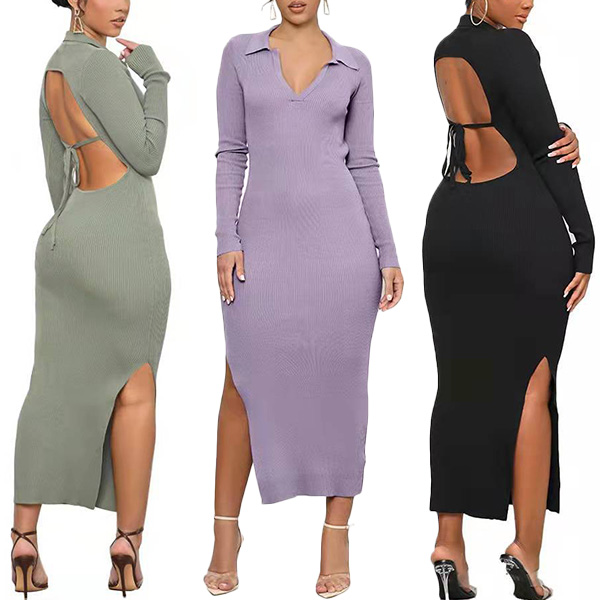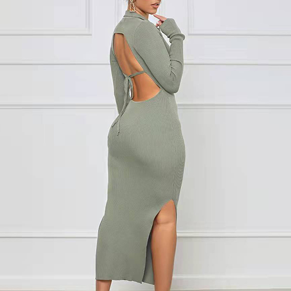 Sexy Solid Color V-neck Backless Slit Long Sleeve Ribbed Bodycon Dress
