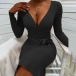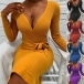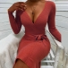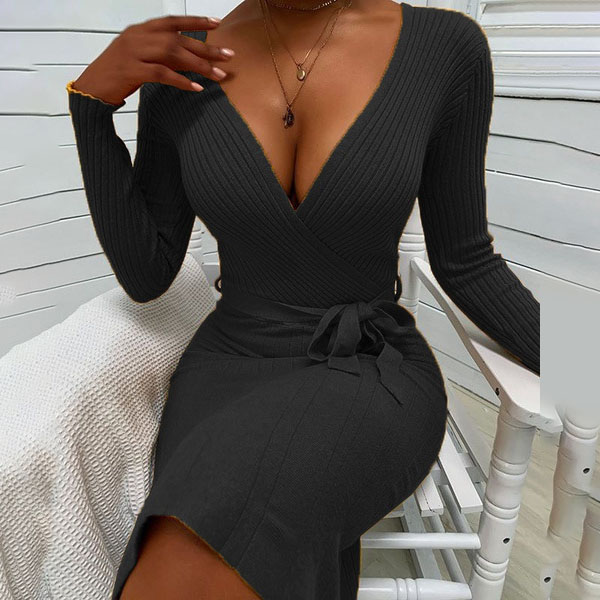When it is not that cold, knitted dress is the best fashion piece. Solid color, bright and attractive. The deep V-neck design, your alluring lines of neck and chest can be showcased perfectly. Decorated with belt, it makes your waist look slimmer. With this dress, your autumn fashion look will be completed.