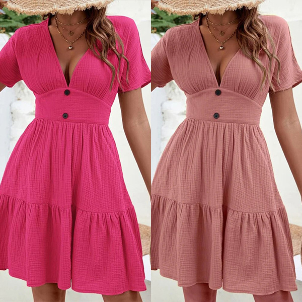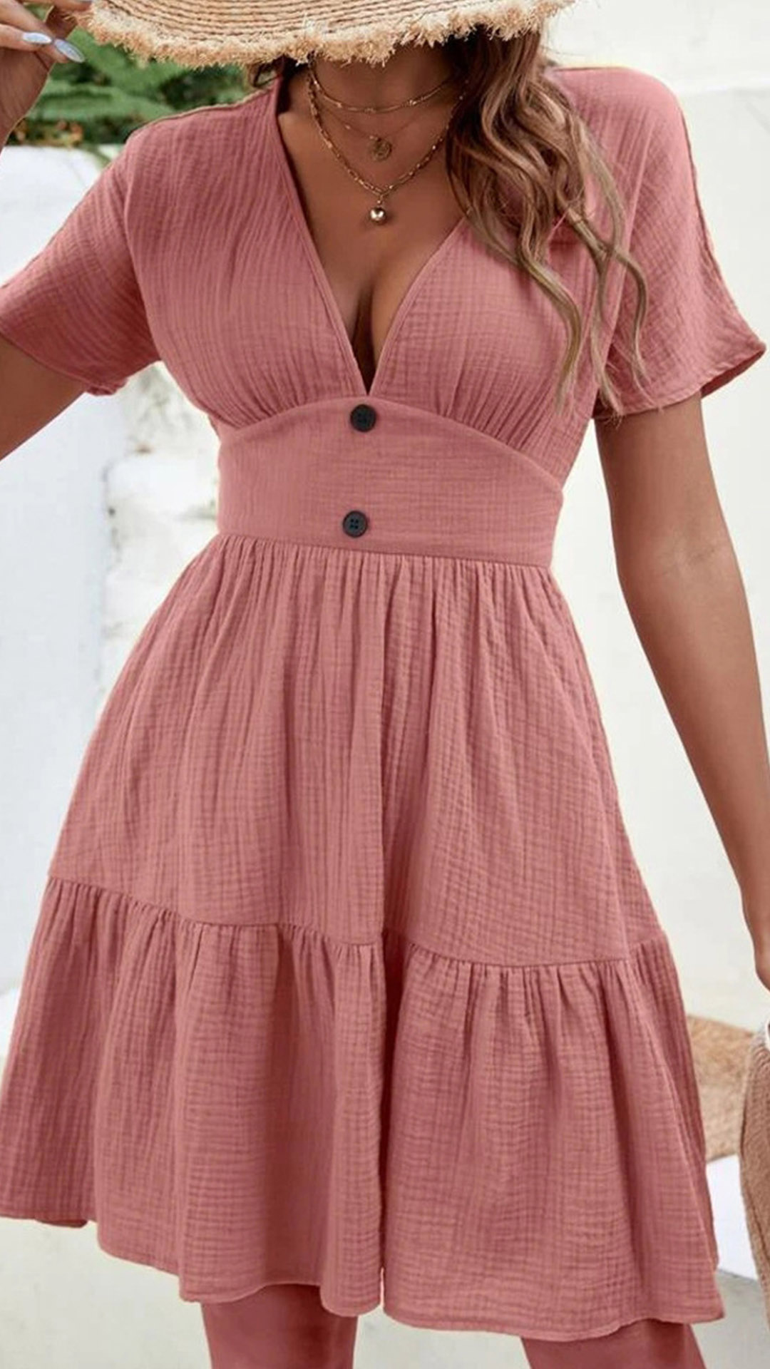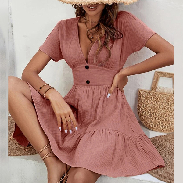This dress effortlessly combines sophistication with a touch of allure, making it a must-have for your collection. The V-neckline adds a hint of sensuality, while the button detailing adds a charming and chic element. The cinch waist design beautifully accentuates your silhouette, creating a flattering and feminine look.Crafted from high-quality materials, this dress offers a comfortable and breathable fit.