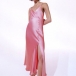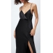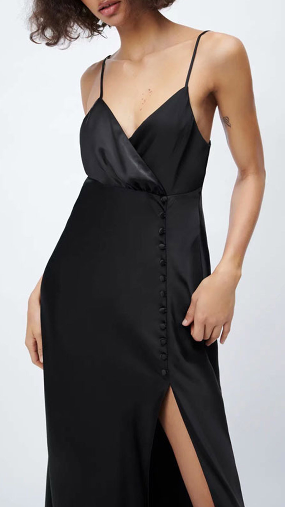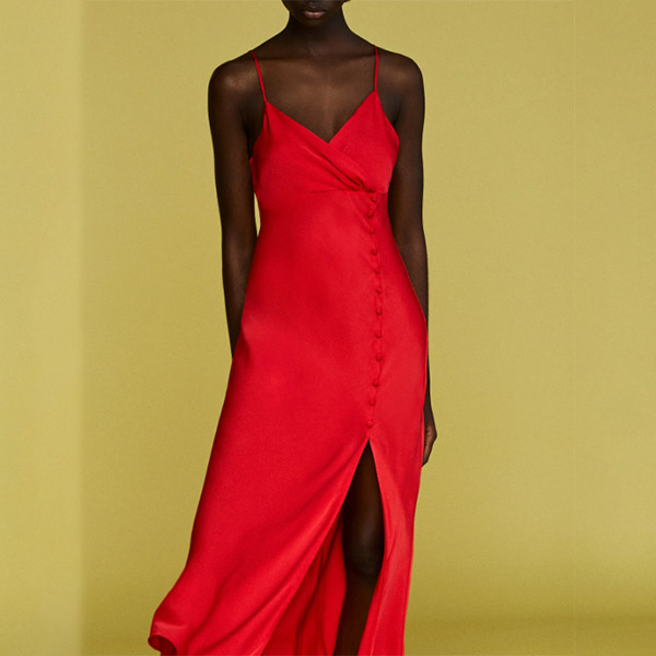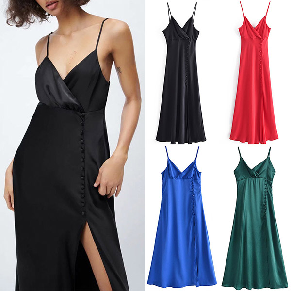 This dress is made from a smooth and sleek satin fabric, and features a plunging V-neckline, and a high slit up the skirt with buttoned decoration. Dress it up with some heels and sparkly jewelry for a night out on the town!