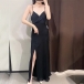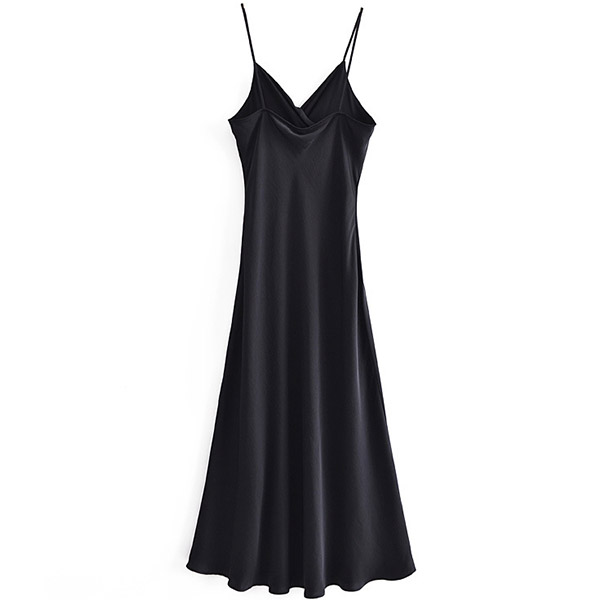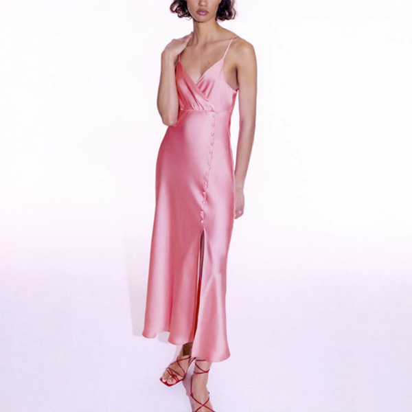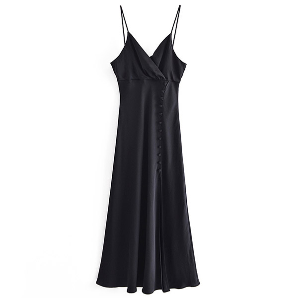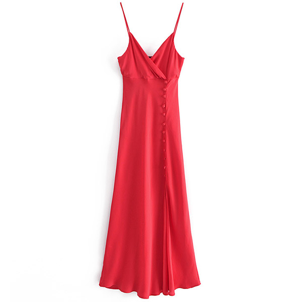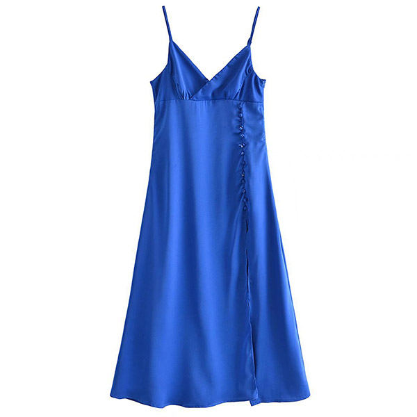 Sexy Solid Color V-neck Buttoned Slit Slip Satin Dress