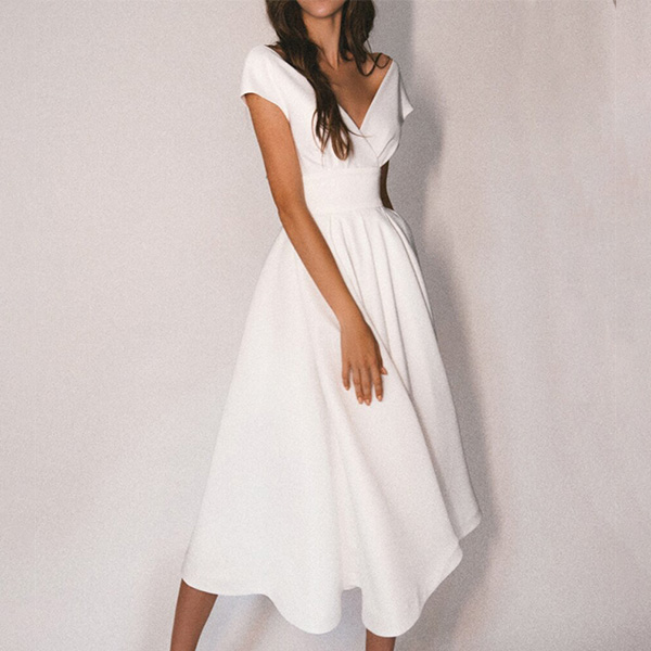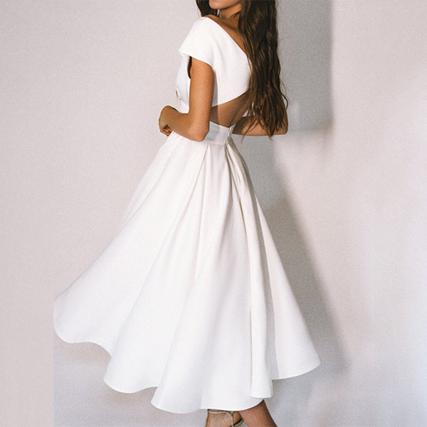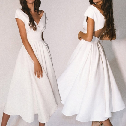 Sexy Solid Color V-neck Cap Sleeve Backless Midi Dress