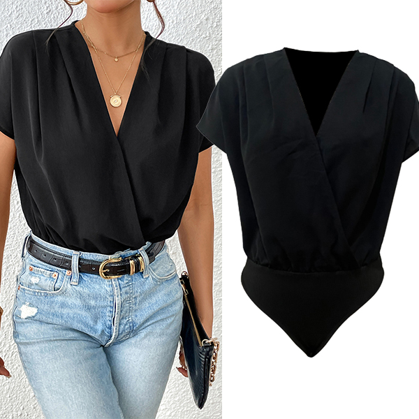 This bodysuit features a flattering V-neckline, cap sleeves, a solid color design, and a figure-hugging fit for a sexy and sophisticated ensemble.