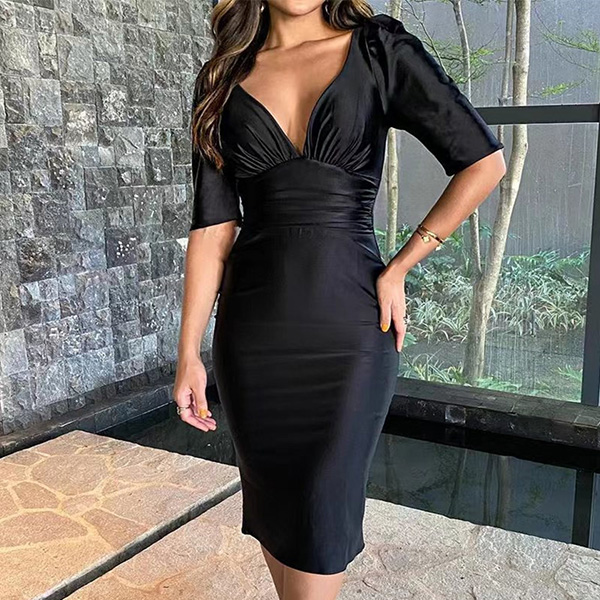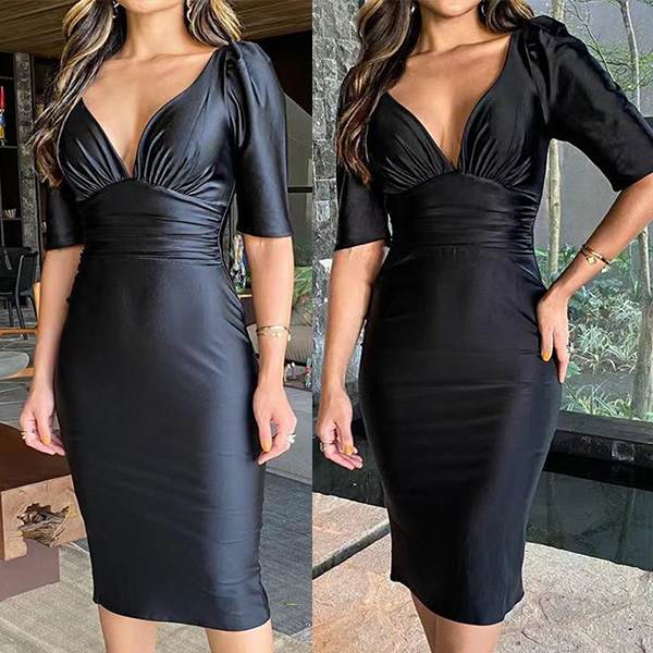 This sexy dress features solid color design, a deep V-neckline, and elbow-length sleeves for a sexy and confident look. The bodycon fit hugs your curves and accentuates your figure, creating a sleek and confident look. Wanna have a try?