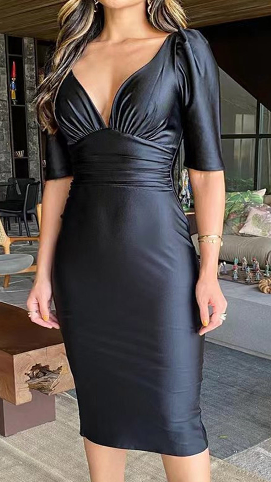 Sexy Solid Color V-neck Elbow Sleeve Bodycon Dress
