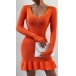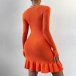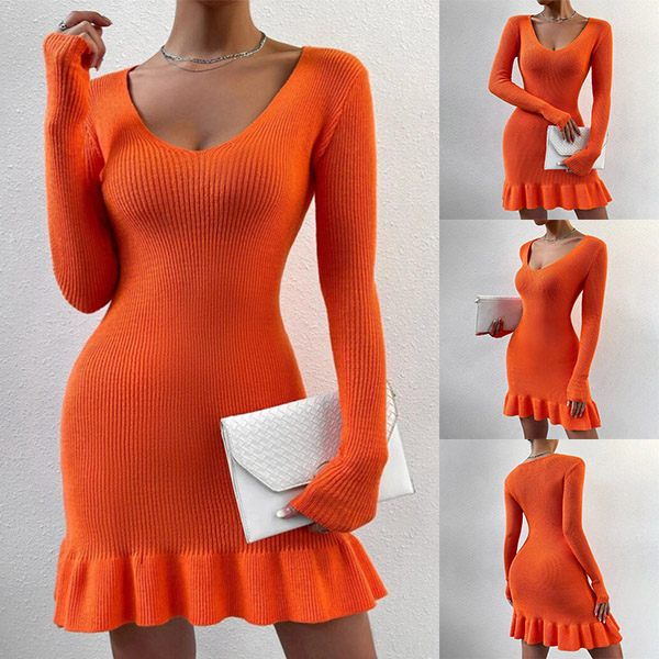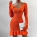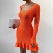 Sexy Solid Color V-neck Long Sleeve Ruffle Hem Line Ribbed Dress