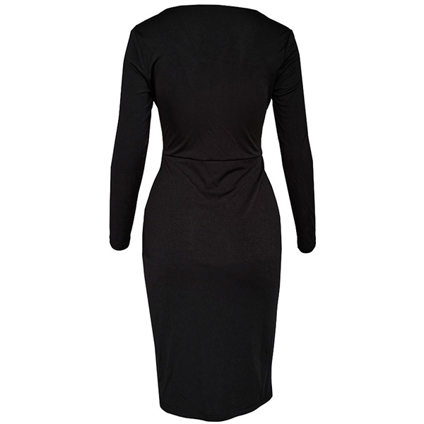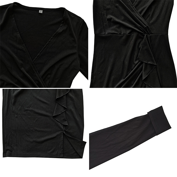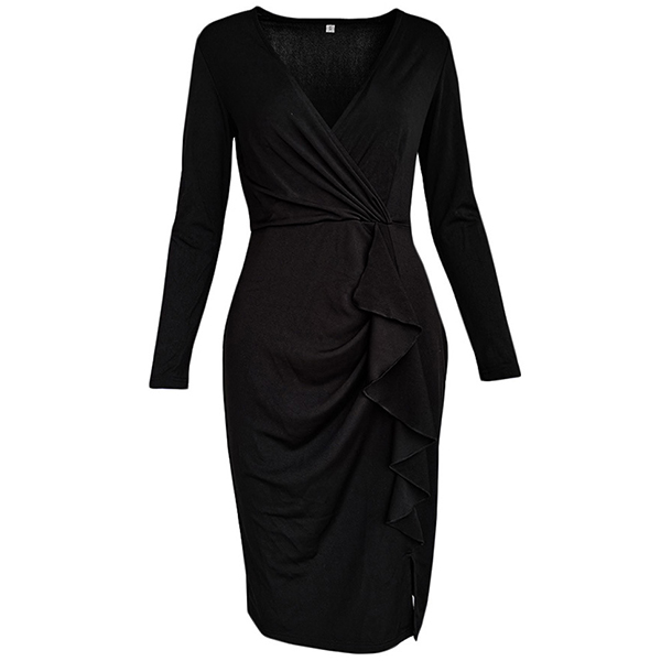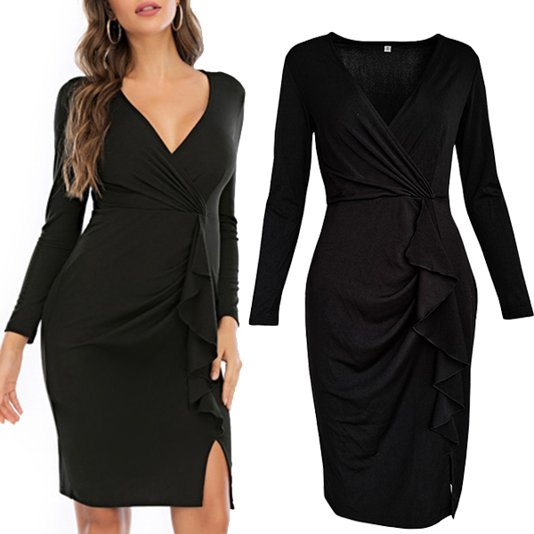 Sexy Solid Color V-neck Long Sleeve Ruffled Slit Bodycon Black Dress