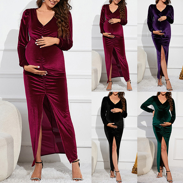 Sexy Solid Color V-neck Long Sleeve Slit Maternity Dress