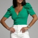 Sexy Solid Color V-neck Puff Sleeve Ribber Shirt