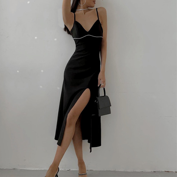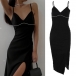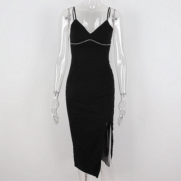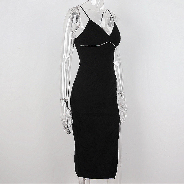 Sexy Solid Color V-neck Rhinestone Slit Bodycon Slip Dress