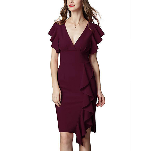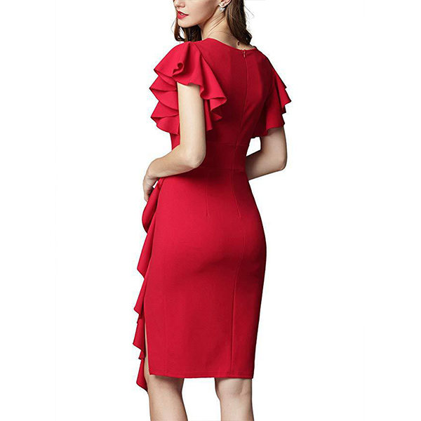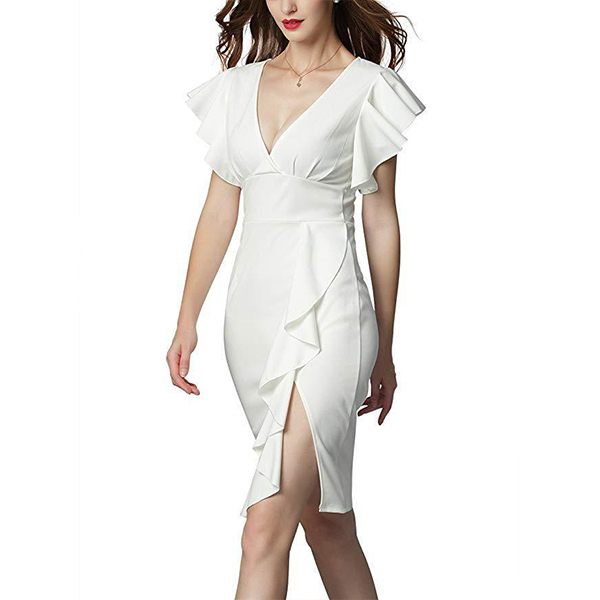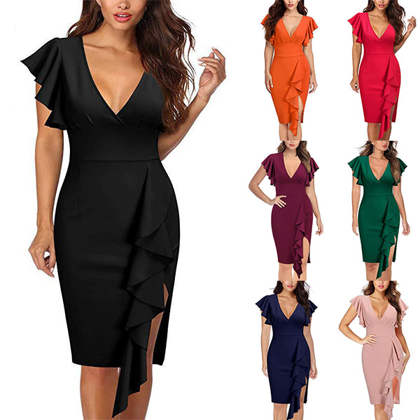 Sexy Solid Color V-neck Ruffle Slit Bodycon Dress
