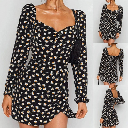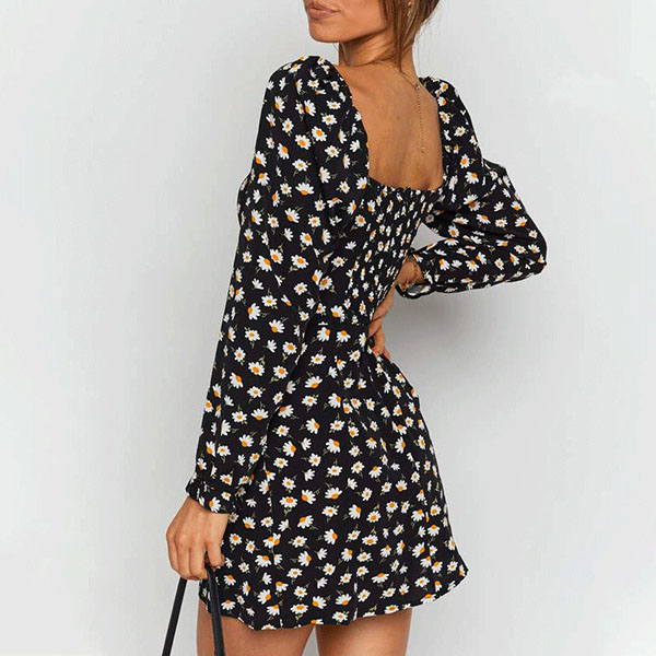 Sexy Square Collar Long Sleeve Daisy Printed Dress