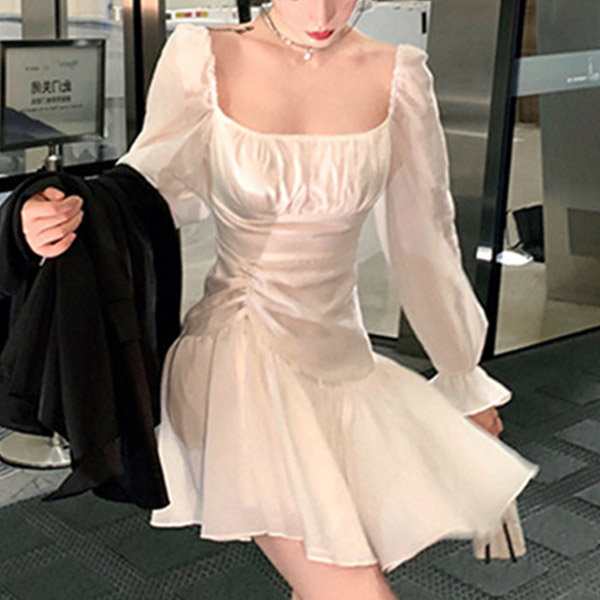 Sexy Square Collar Long Sleeve Elastic Wrinkled Dress