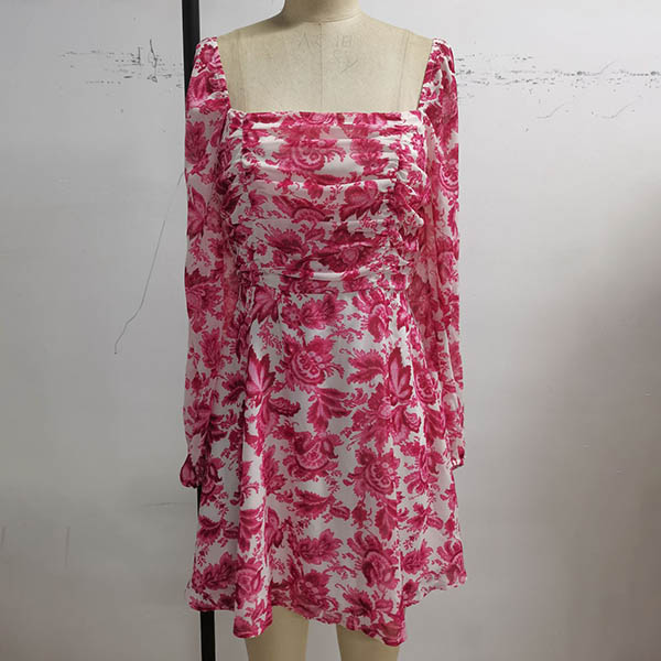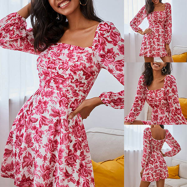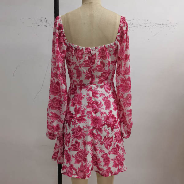 Sexy Square Collar Long Sleeve High Waist Printed Dress