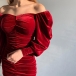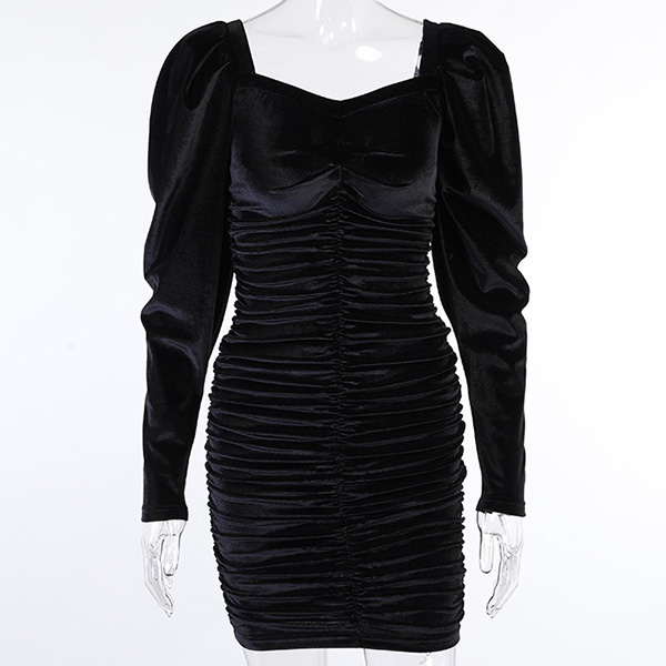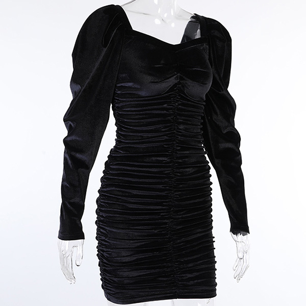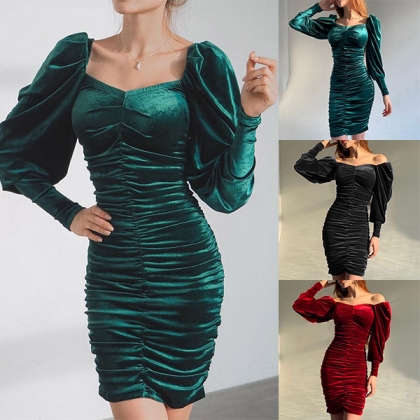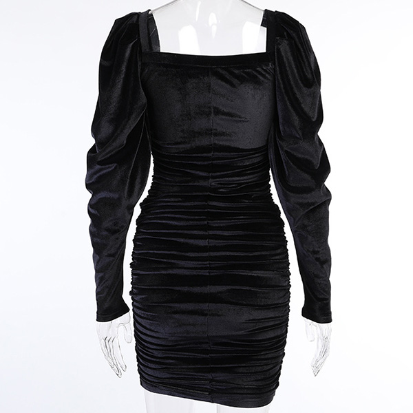 Sexy Square Collar Puff Sleeve Solid Color Slim Fit Dress