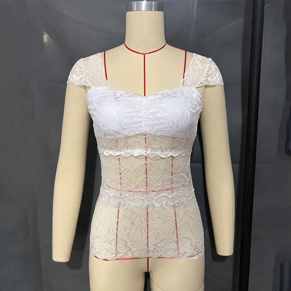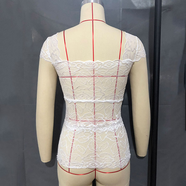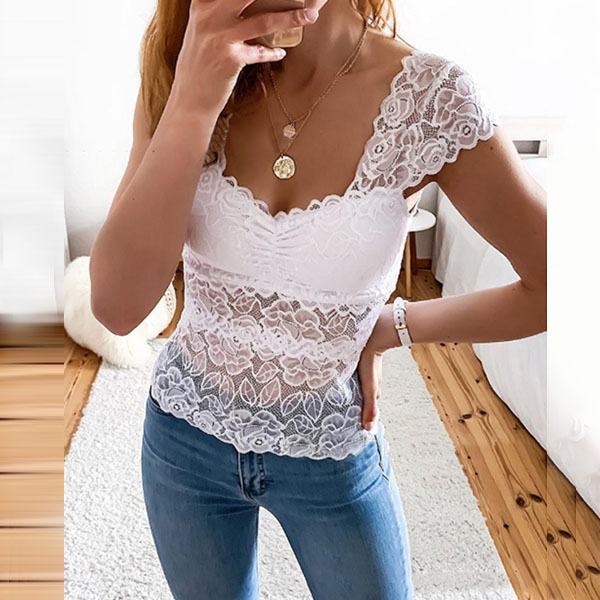 Sexy Square Collar Short Sleeve Slim Fit See-through Lace Top