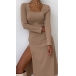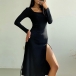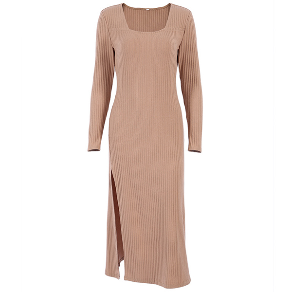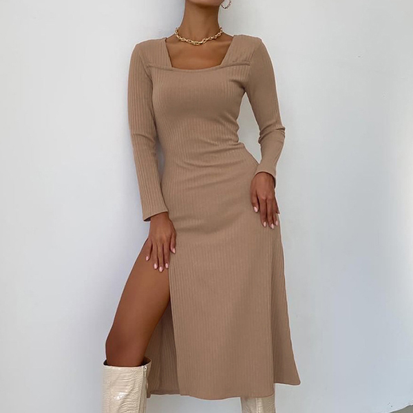 Sexy Square Collar Slit Hem Long Sleeve Solid Color Slim Fit Dress