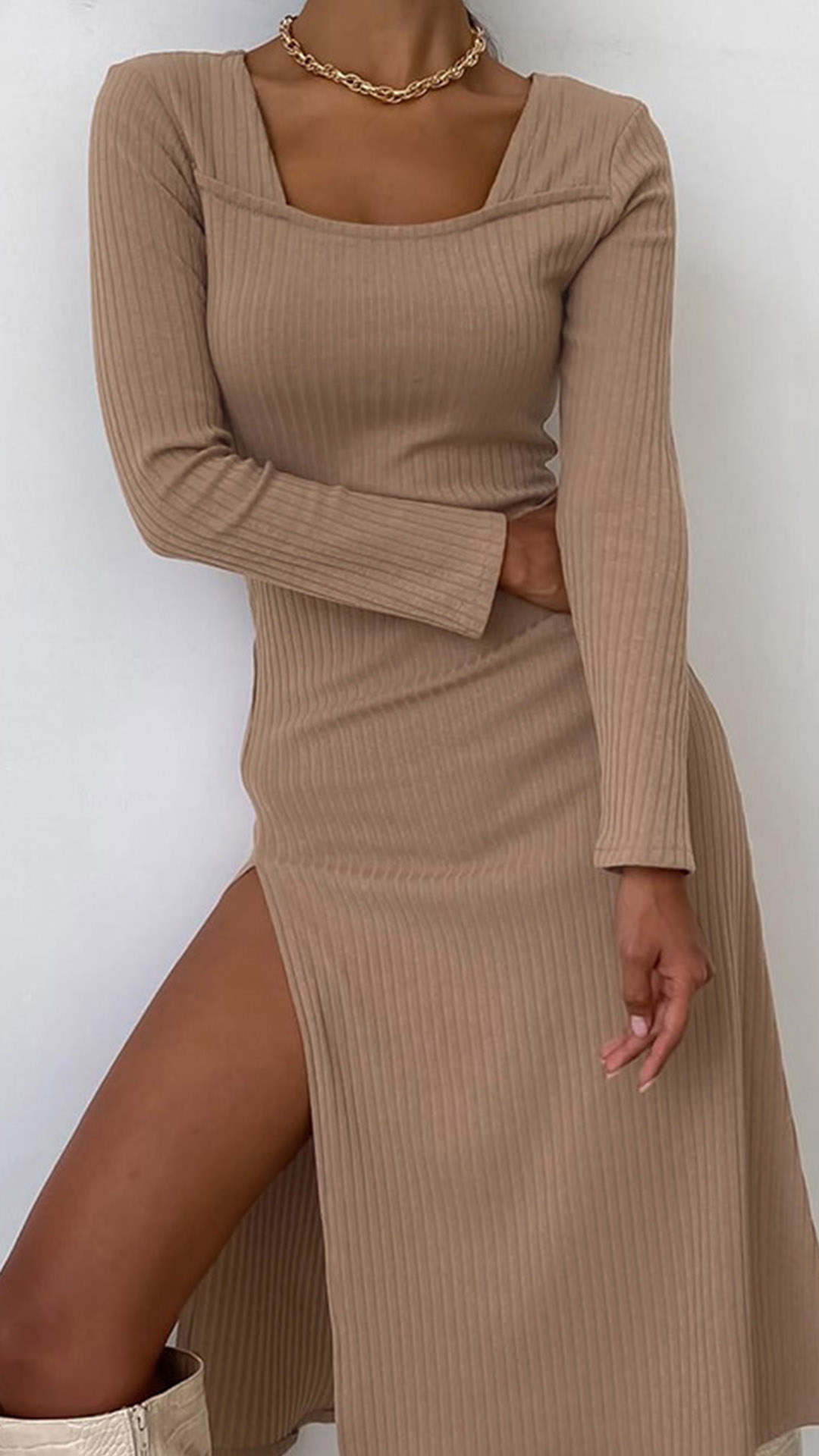 When the days get a little breezy and cold,this long sleeve dress would be your wise choice. Solid color style,the square collar and slit hem design can offer you a sassy,flirty and sexy look. Meanwhile,its soft and breathable fabric can ensure you an utmost comfort.