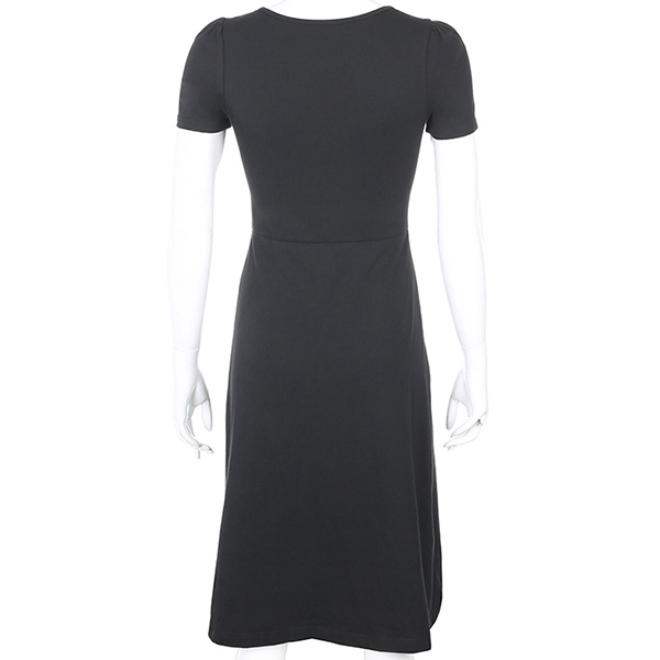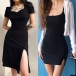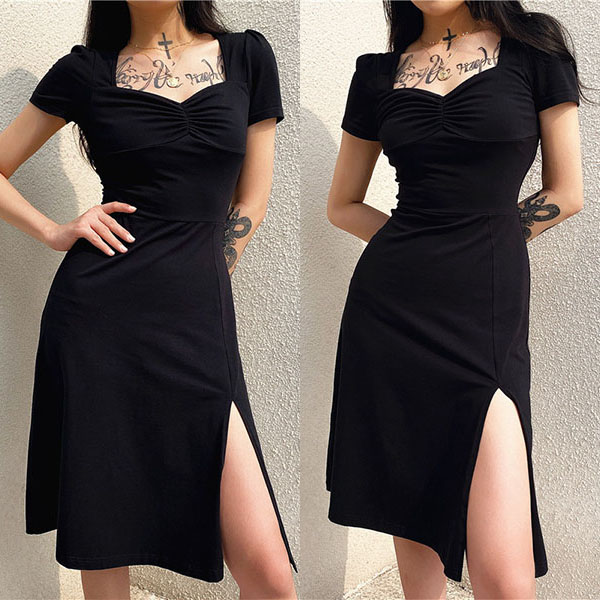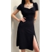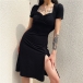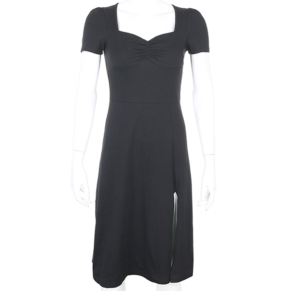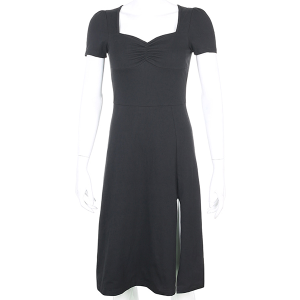 Sexy Square Collar Slit Hem Short Sleeve Solid Color Slim Fit Dress