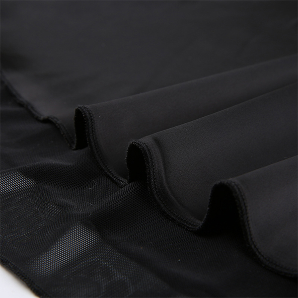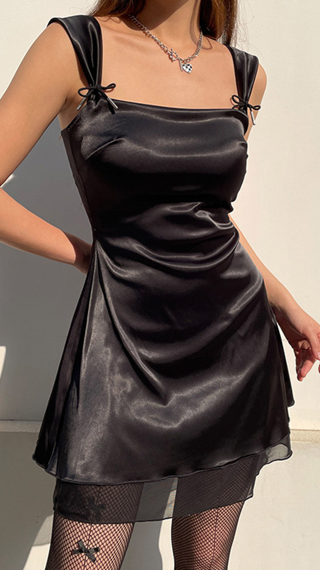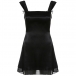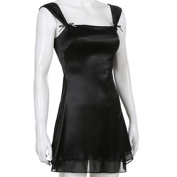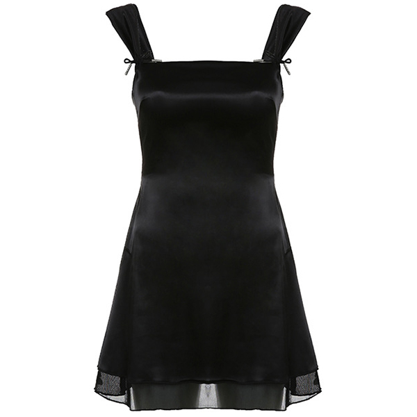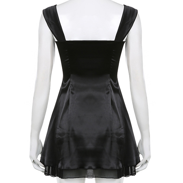This black mini dress features square neckline and gauze spliced hemline for a sexy and chic look.