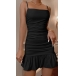 This black dress features a square neckline, a daring backless design, ruched detailing, and a ruffled hemline, perfect for a sultry and glamorous look. Wanna have one?