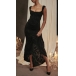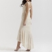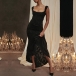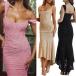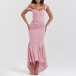 This lace dress features a squared neckline, backless design, ruched cinch waist, and fishtail hemline, creating a sultry and elegant look. Perfect for party wear!
